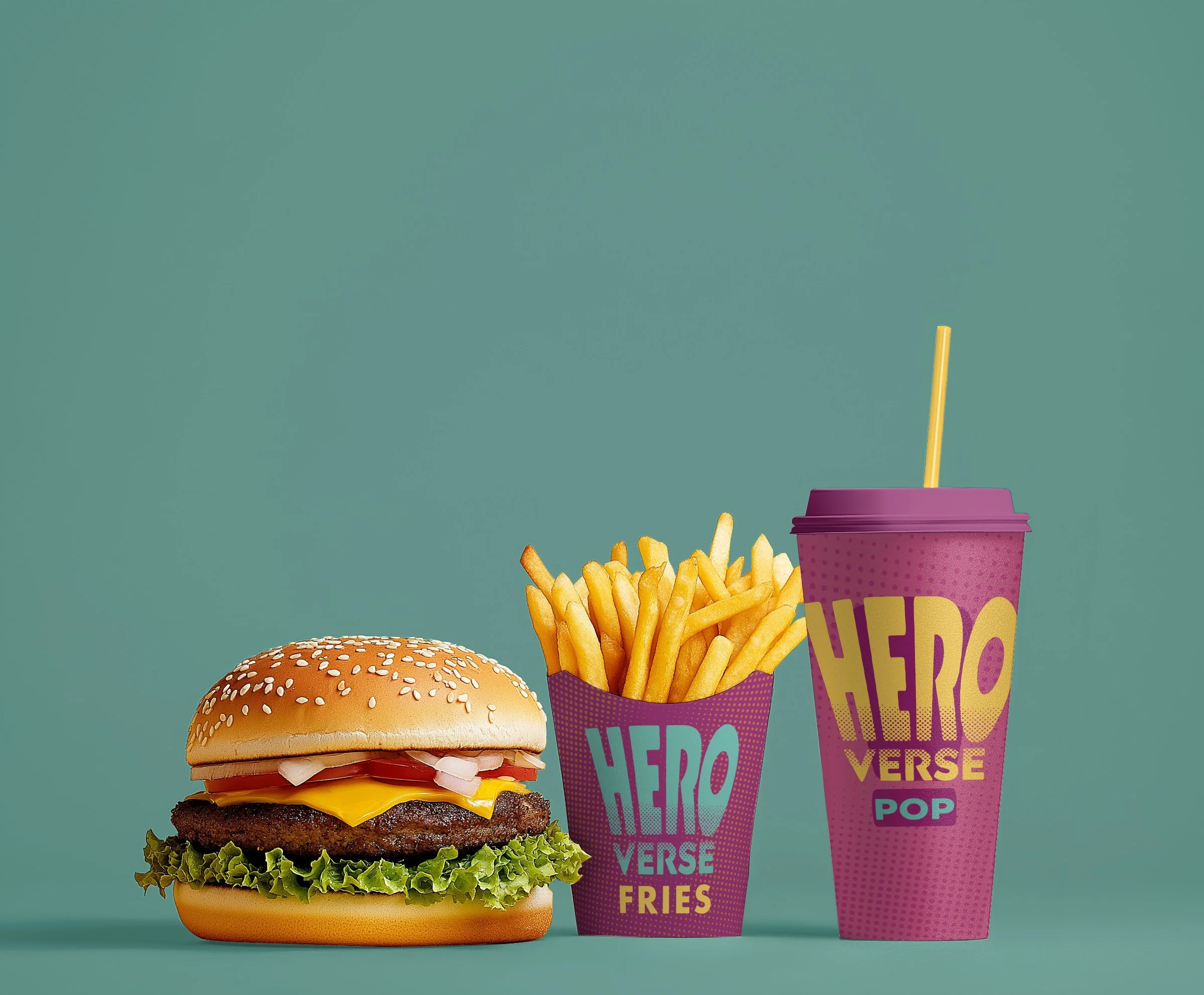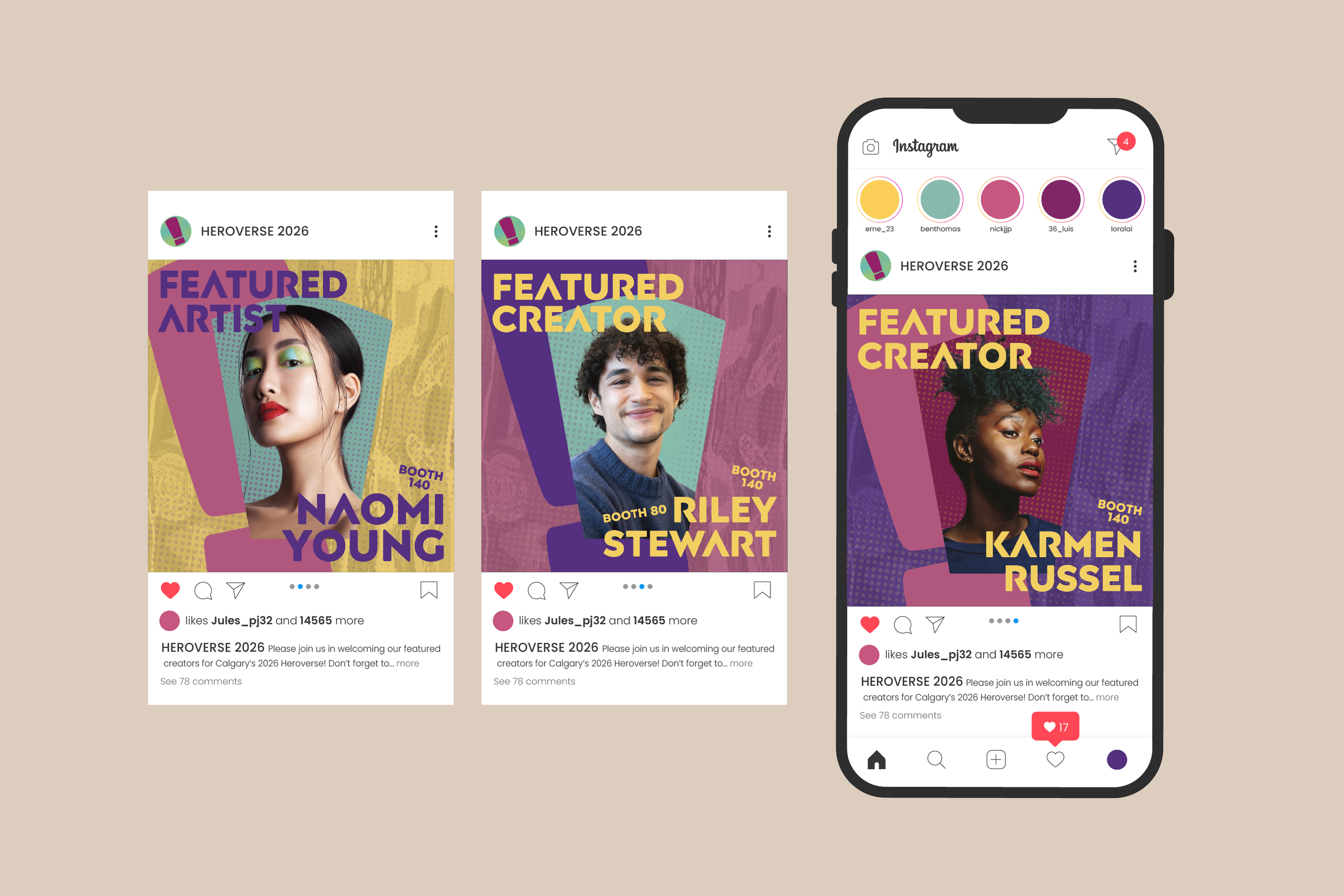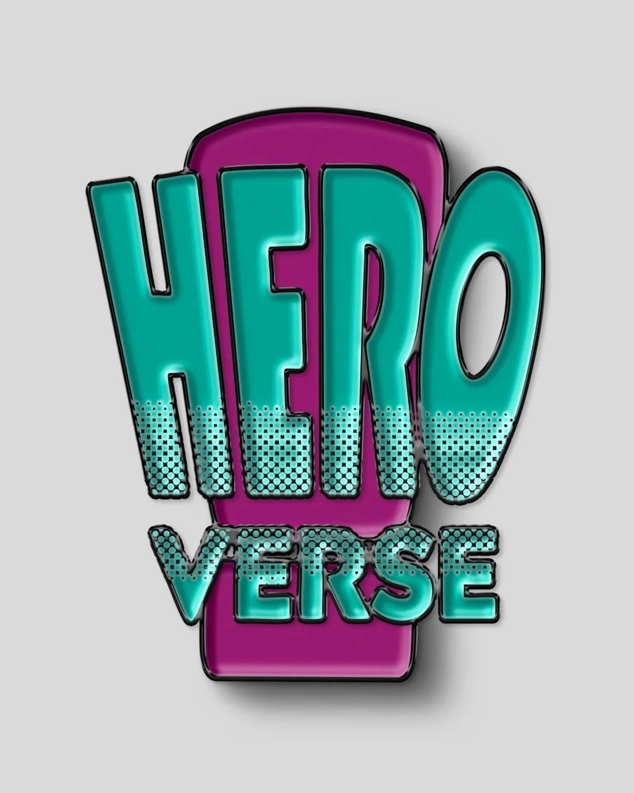 The HEROVERSE logo uses bold, reshaped typography paired with a halftone gradient to instantly connect to classic comic visuals. The halftone effect nods to vintage comic printing while visually representing our theme of “reshaping ideas”, the dots stretch, fade, and transform, echoing the evolution of hero narratives. The dynamic letterforms reference comic onomatopoeia and align with our exclamation-mark symbol, reinforcing energy, empowerment, and breaking boundaries. Overall, the logo blends familiar comic tradition with forward-thinking expression, capturing HEROVERSE as a space for creativity, identity, and transformation.